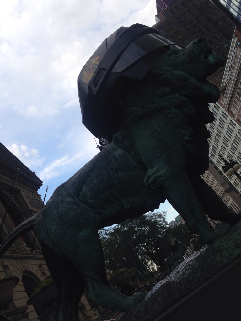 So it was goodbye to Chicago and as I said my Goodbyes to my roomies I managed to take my last pic from outside my yellow taxi window of a lion statue with an oversized ice hockey helmet on! Yes that’s right, Chicago was still buzzing from winning that all important Stanley Cup it seemed and that trophy size is just plain ridiculous!