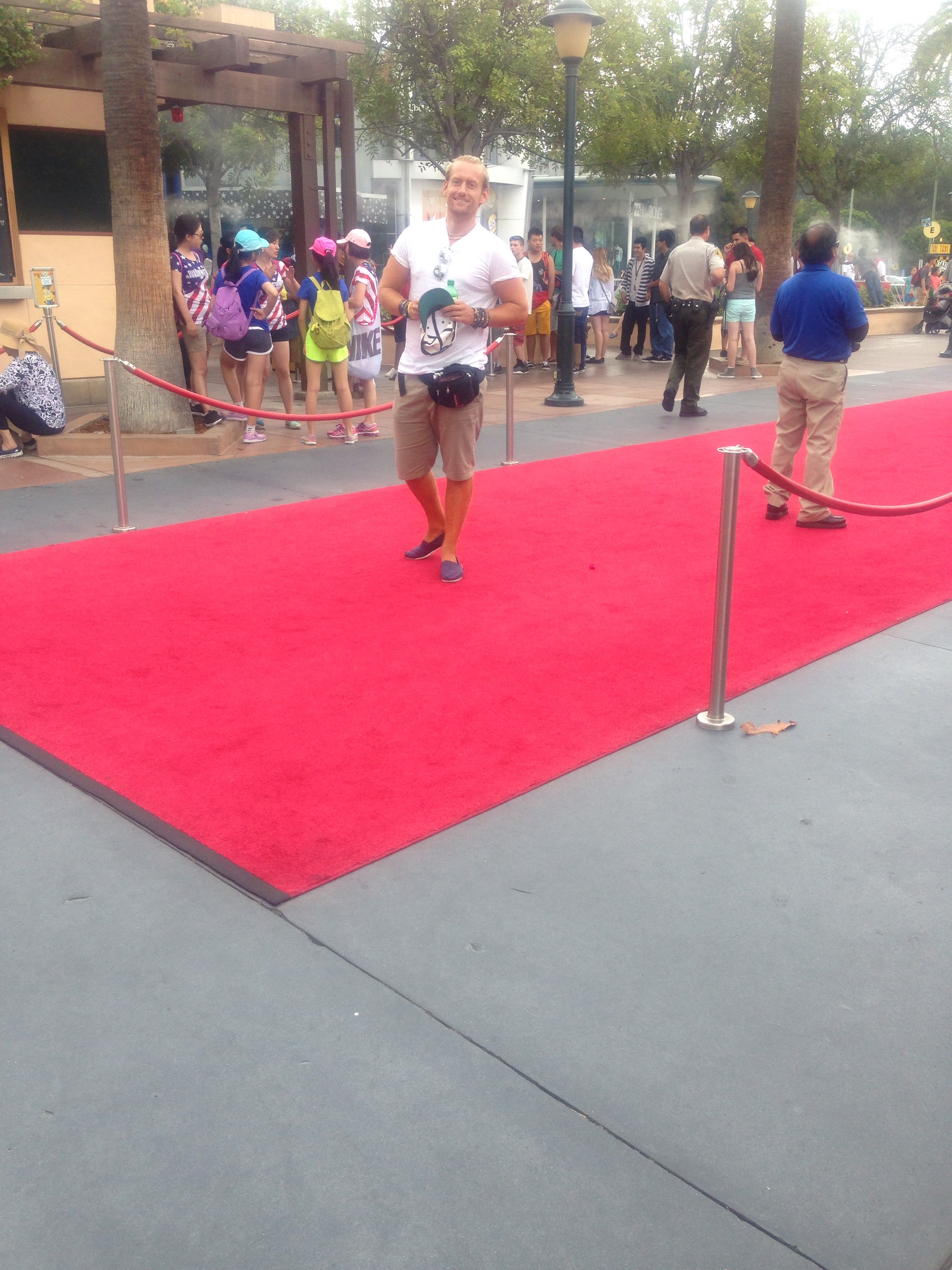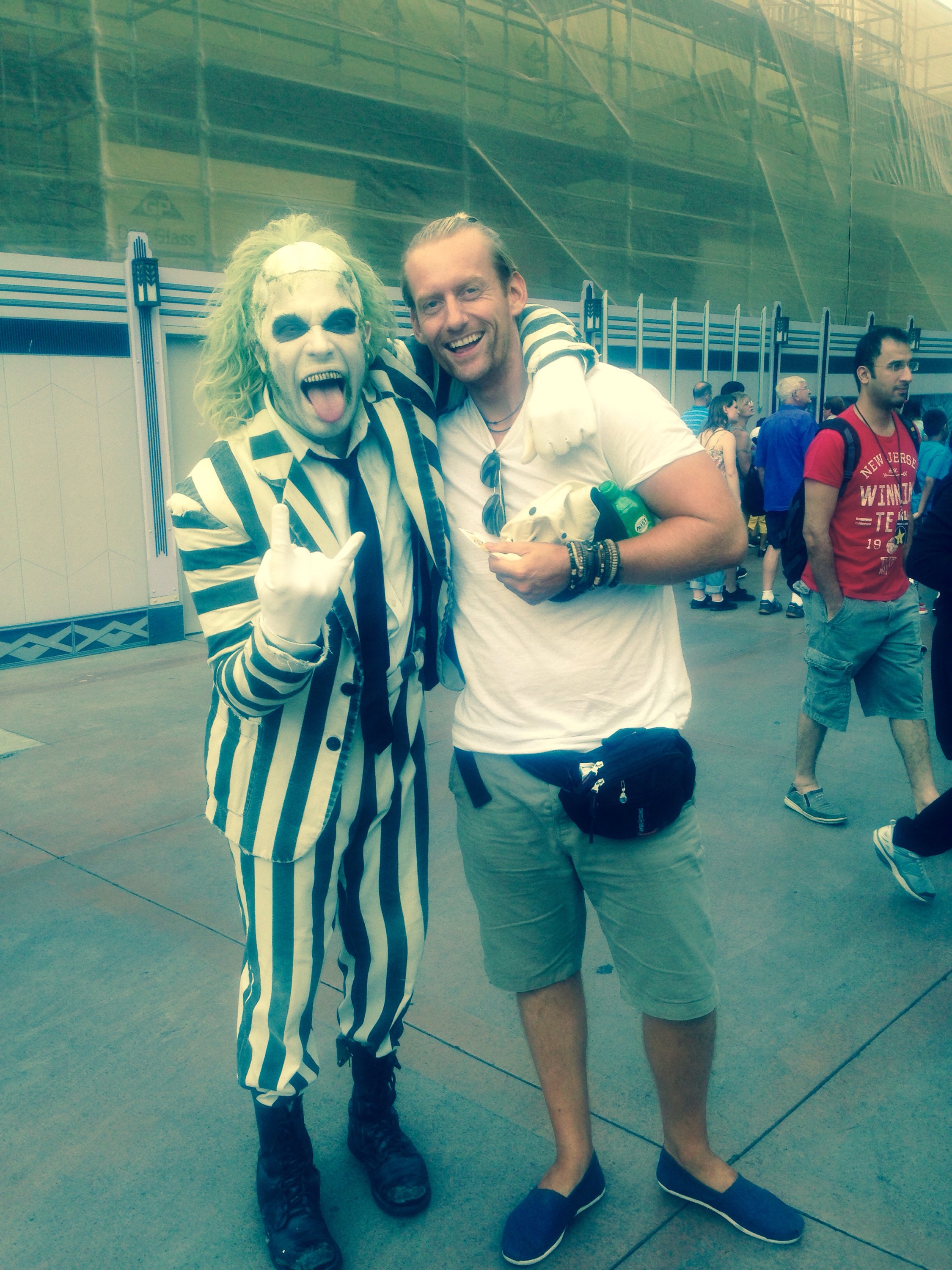 So we boarded one bus that took us into Hollywood Boulevard then boarded a small shuttle bus that takes you right up to the top of the hills and this is where Universal Studios is. Word of advice before you go inside, grab some food in the market outlet strip before you go in and also look for discounted price entry tickets, do not make same mistake we made. $80 entry fee! Ouch but we here now so guess we pay it and hope for best. Red carpet after paying to get in, we have arrived ;). The expensive fee covers you for everything bar food. I bump into a Beetlejuice impersonator on my way in, he’s keen for a selfie!