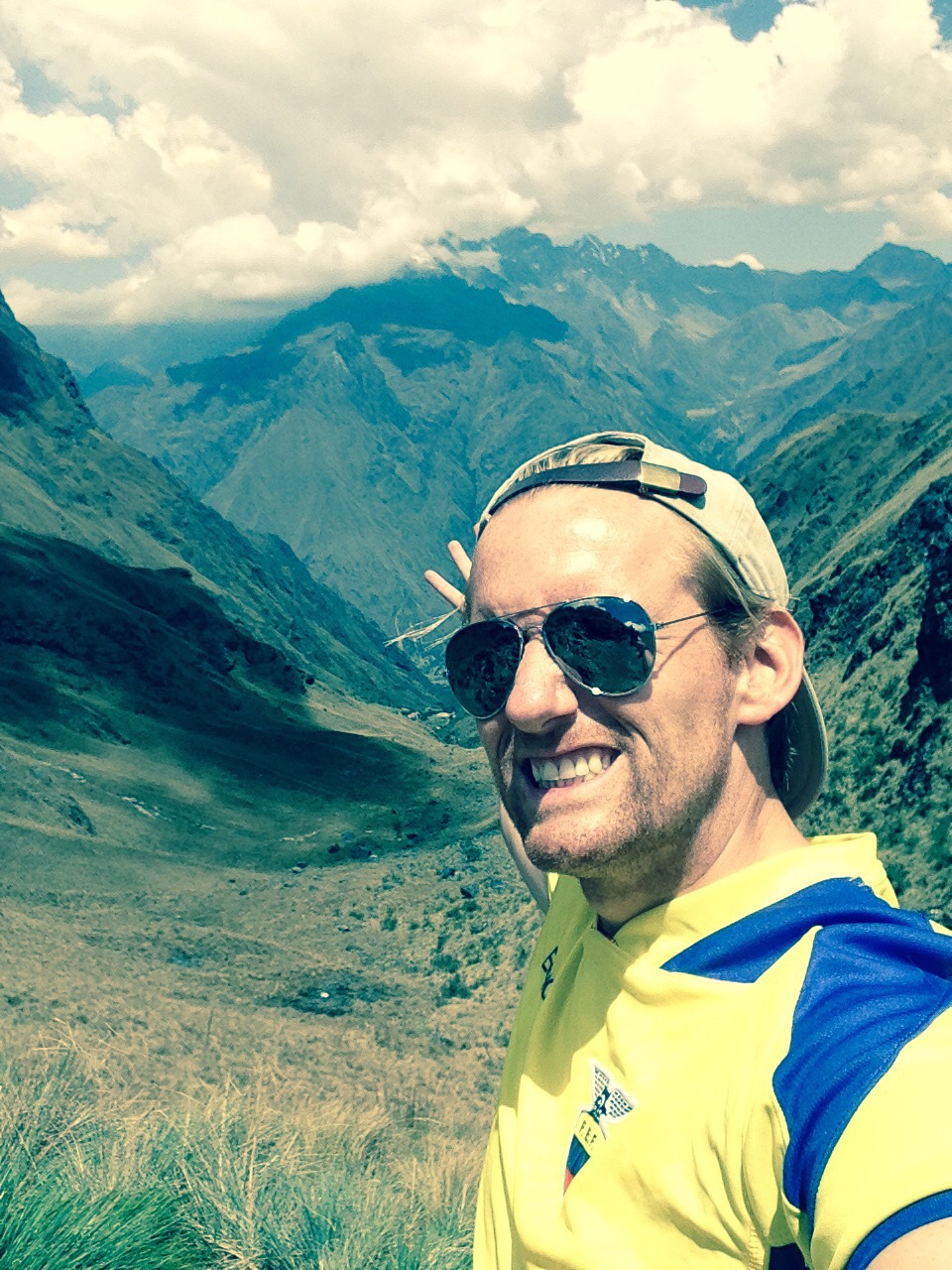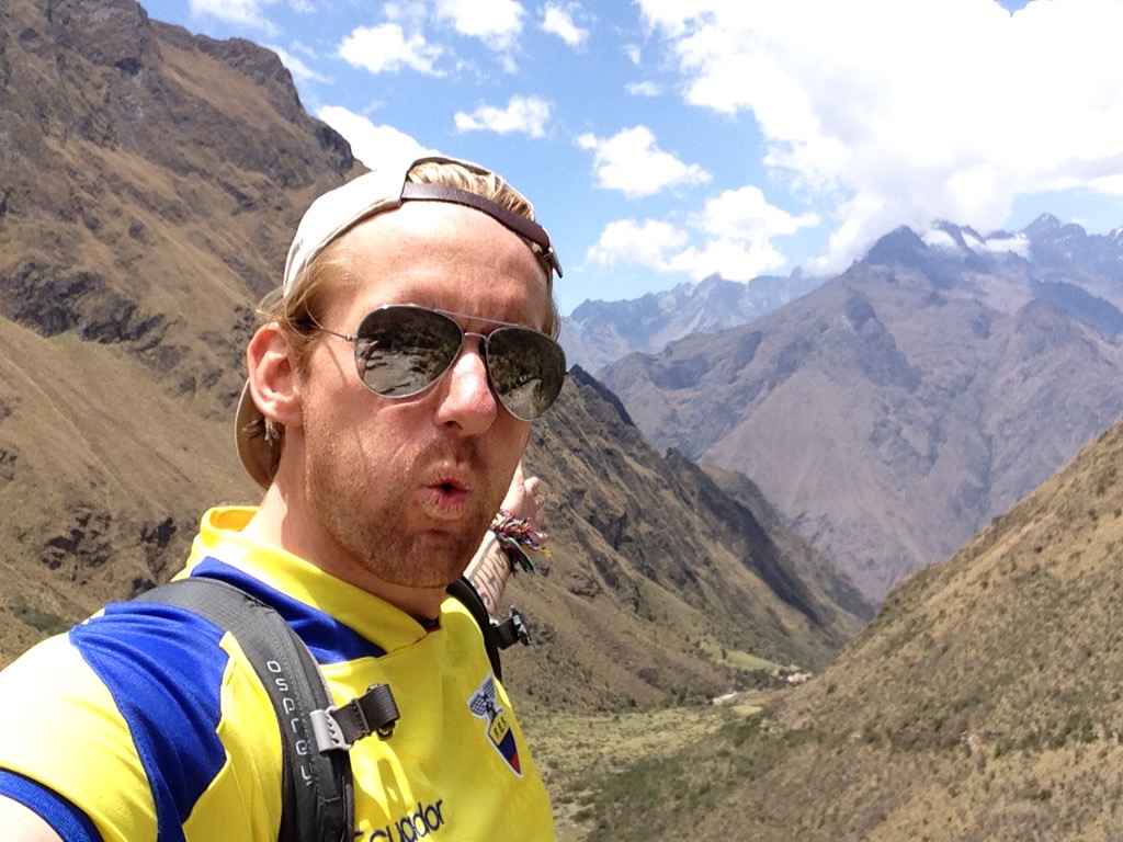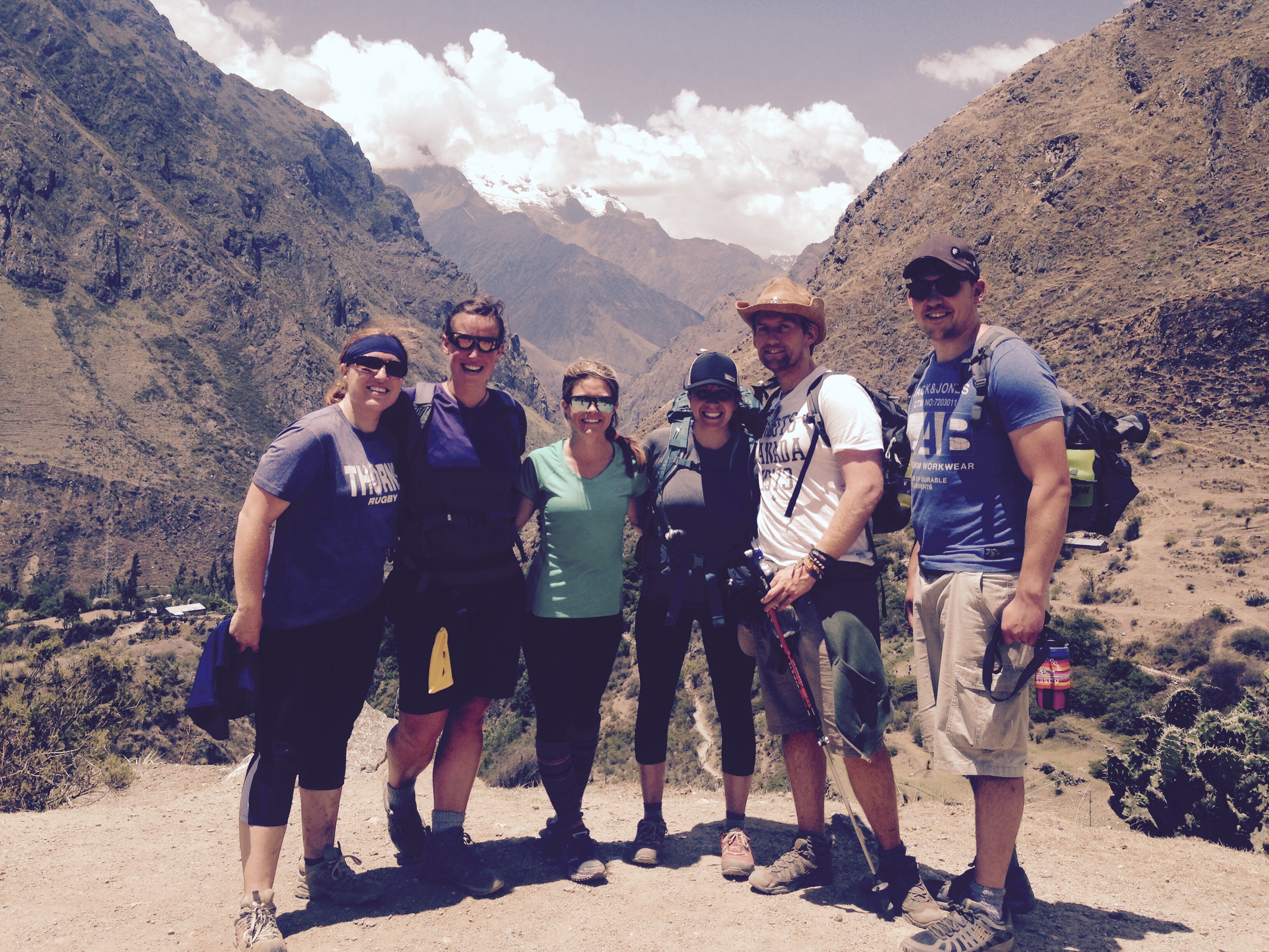 So back to the last afternoon of the trail after our mammoth sugar overload of cake! Just a few more hours now and we are at the last campsite for the last supper. If I’m honest the last part of the hike was probably the easiest so far as it was mainly up and down and but neither continuously. Feet were sore and all of us had been bitten by the dammed small flies that took pleasure in biting us all, particularly Bex! Elias showed us two more archaeological sites along the way and some with even some llamas to have selfies with! Hi John! It was here where we had one of our most memorable photos sat together all on the edge of which looked like the world. Take a look for yourselves! The Urubamba Valley Sagrado de los Incas! 12,136 ft up (3,700m).
