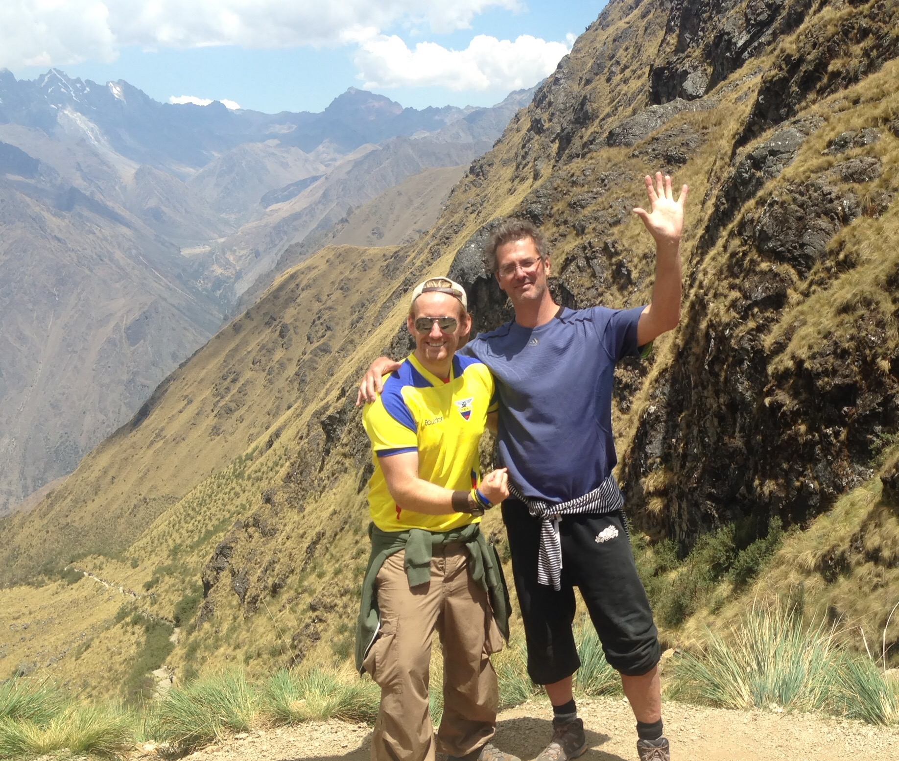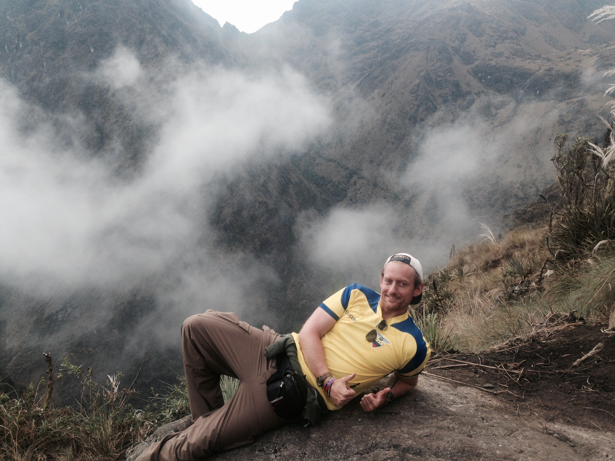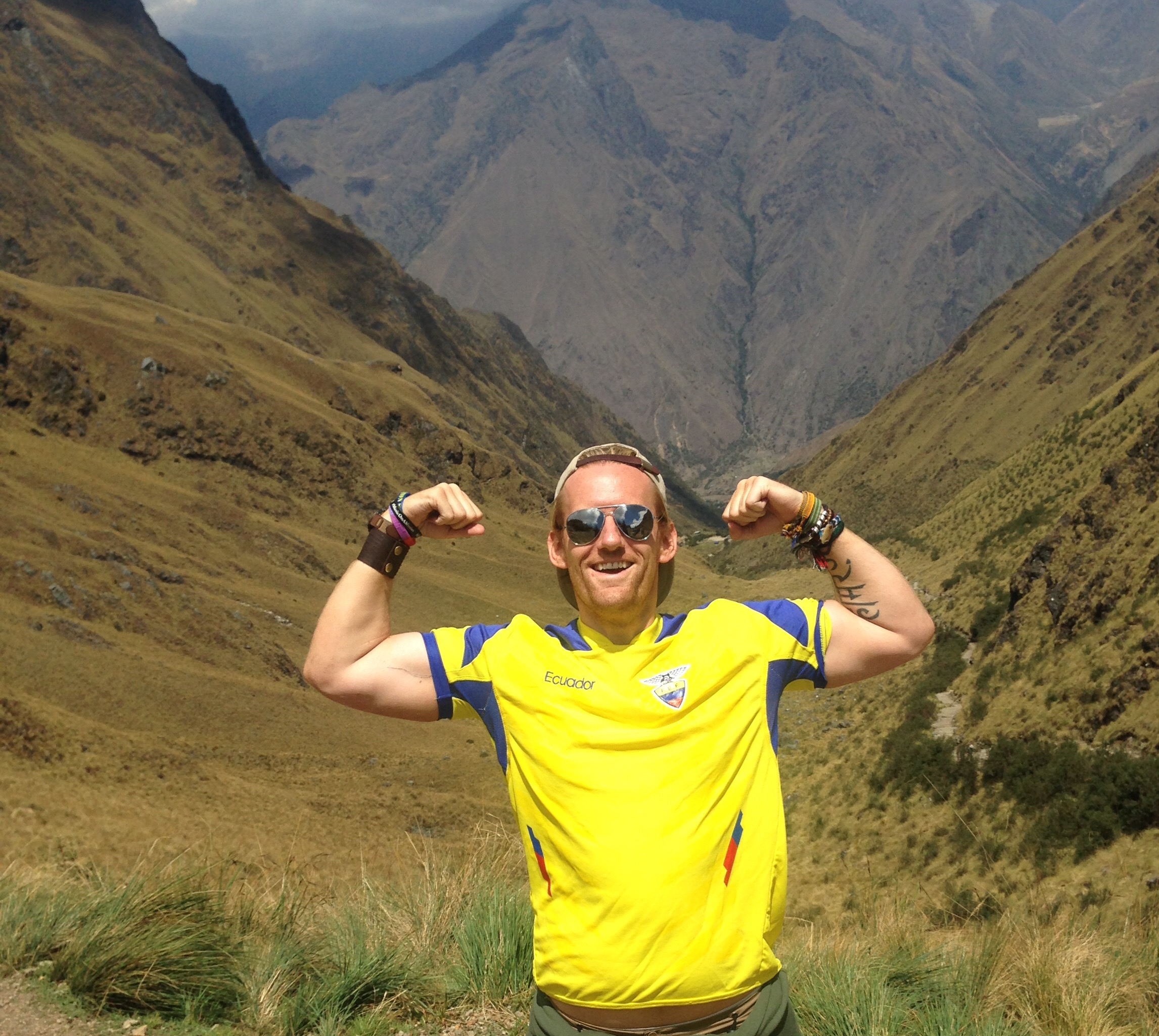 So back to the last afternoon of the trail after our mammoth sugar overload of cake! Just a few more hours now and we are at the last campsite for the last supper. If I’m honest the last part of the hike was probably the easiest so far as it was mainly up and down and but neither continuously. Feet were sore and all of us had been bitten by the dammed small flies that took pleasure in biting us all, particularly Bex! Elias showed us two more archaeological sites along the way and some with even some llamas to have selfies with! Hi John! It was here where we had one of our most memorable photos sat together all on the edge of which looked like the world. Take a look for yourselves! The Urubamba Valley Sagrado de los Incas! 12,136 ft up (3,700m).
