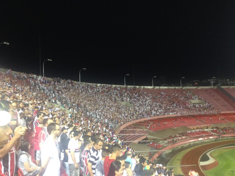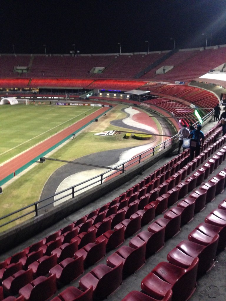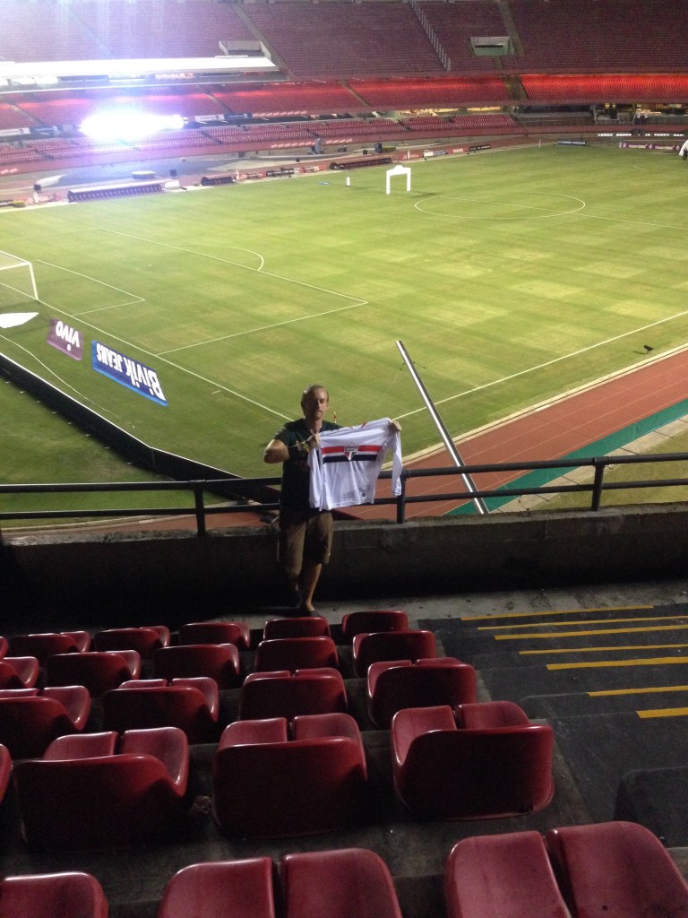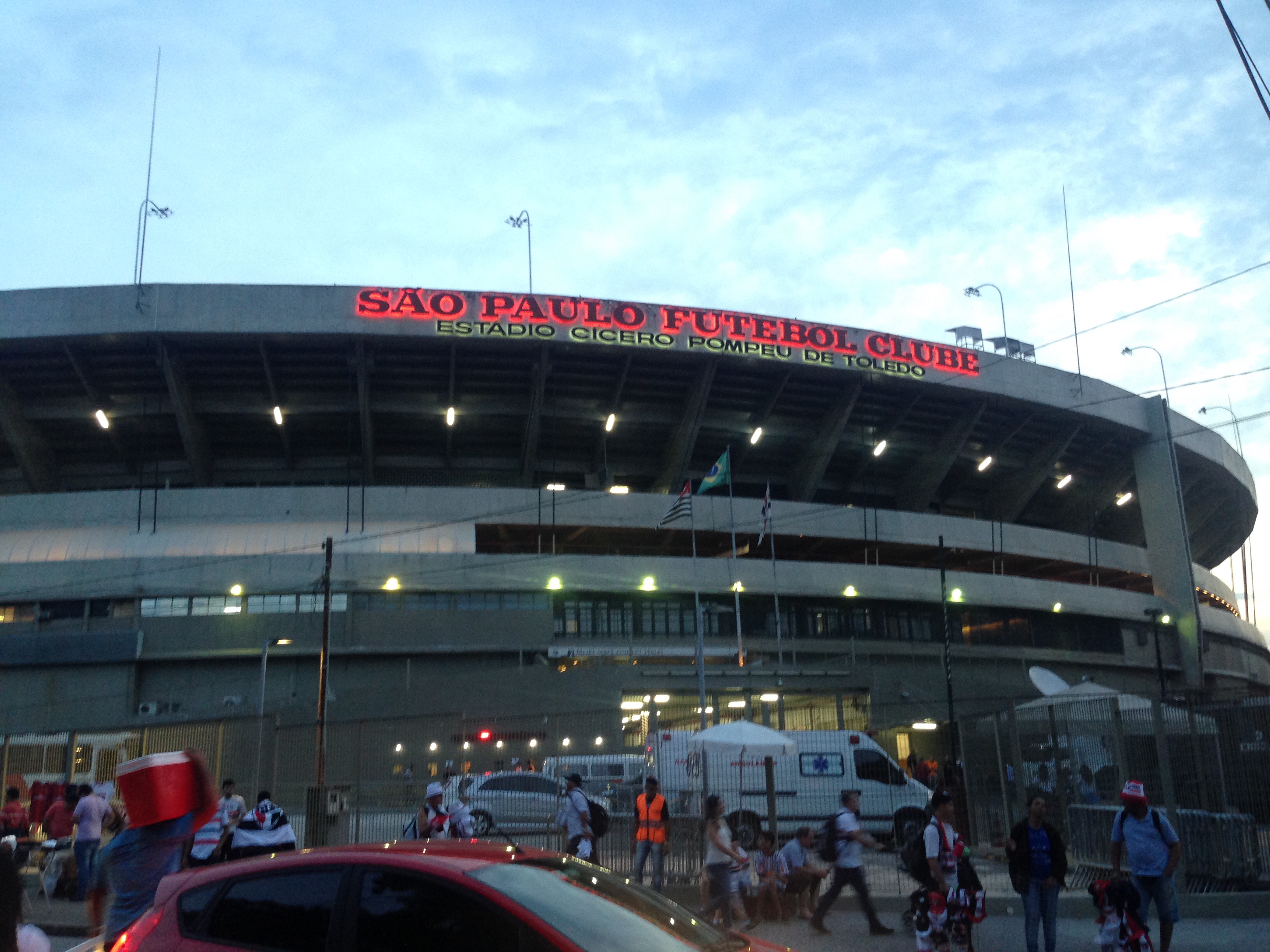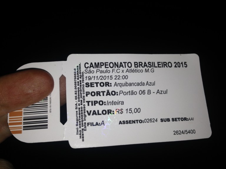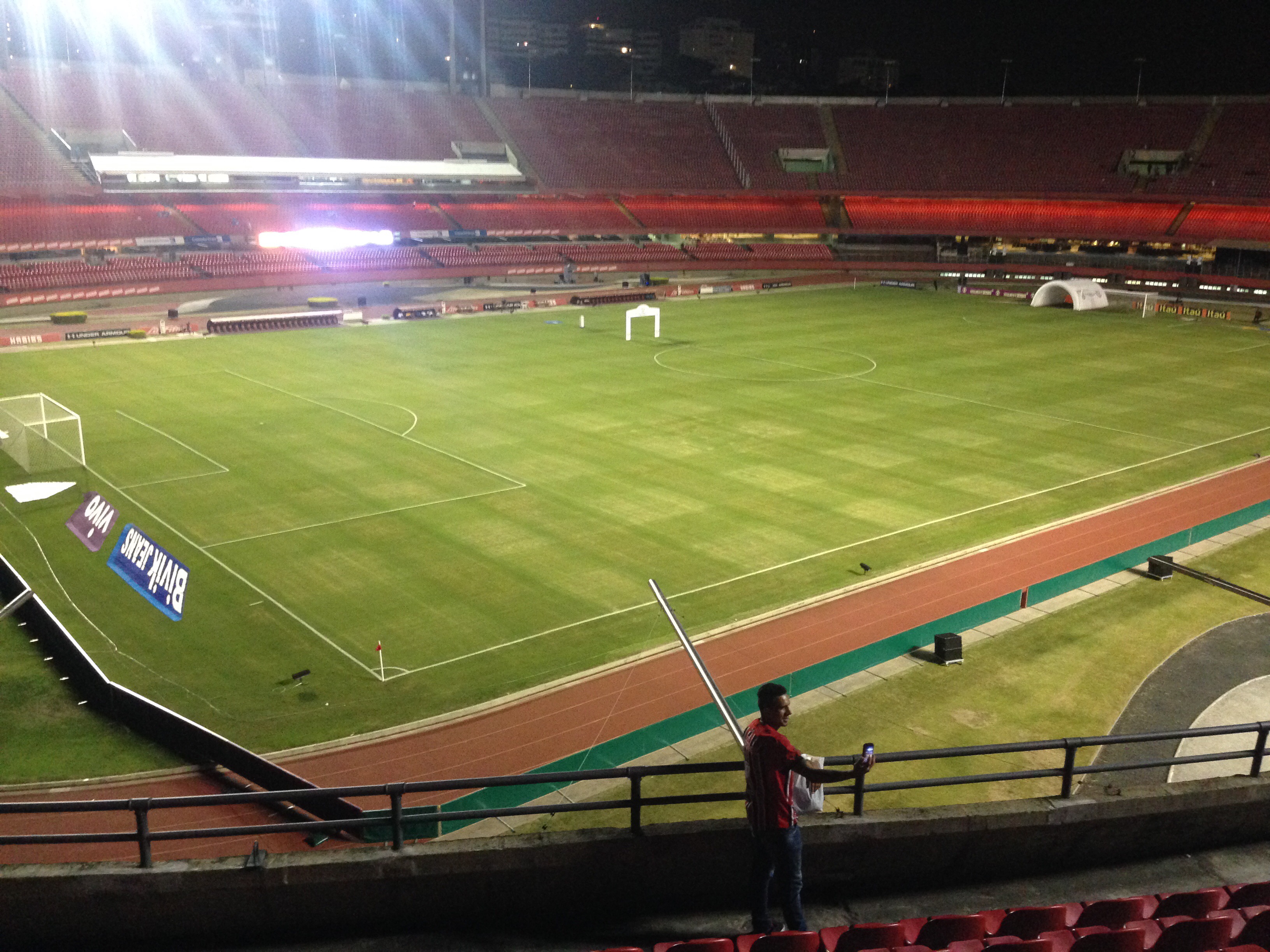 Finally I’m going to experience my first taste of Brazilian football! We arrived with plenty of time before K.O. and this gave me some time to get some photos of the stadium itself and get to have a little walk around where I was. I hadn’t a foggiest how safe the area was or where I was exactly, all I could see infront of me was the huge Estadio do Morumbi. Probably best I get a ticket first! Would you believe it, 45 Brazilian Real for a ticket practically seating anywhere in the stadium! That works out about £12! Just shows you how over priced things are back home! Once purchased I thought might be a good idea to buy a local jersey also! There are guys everywhere selling fake kits and this is like every football fans paradise if your into kit collecting! It did make me laugh though how sheepish they got when local policia went past ha! I found one guy selling shirts which looked as good as the current kit, long sleeved also. It was a dam good fake as he let me inspect it fully, even looked quite real with fact it had on it what looked like the actual kit designer on it as well. It was a no brainer for me. I bartered, got the price down and bought it there and then. Bring it on Minerio!